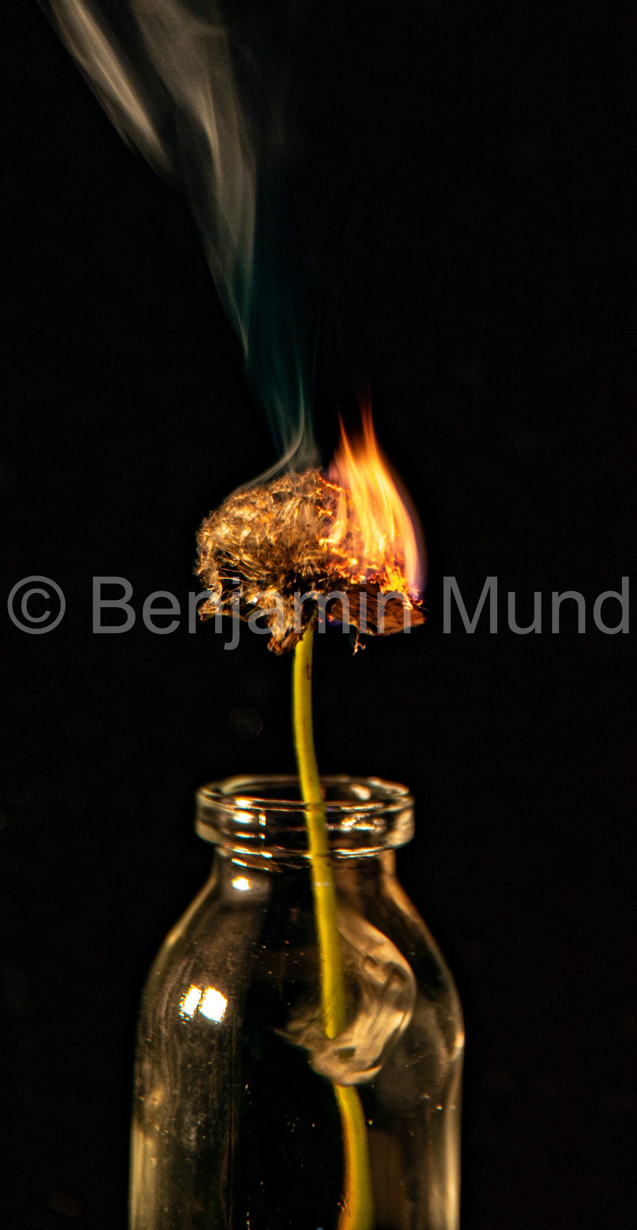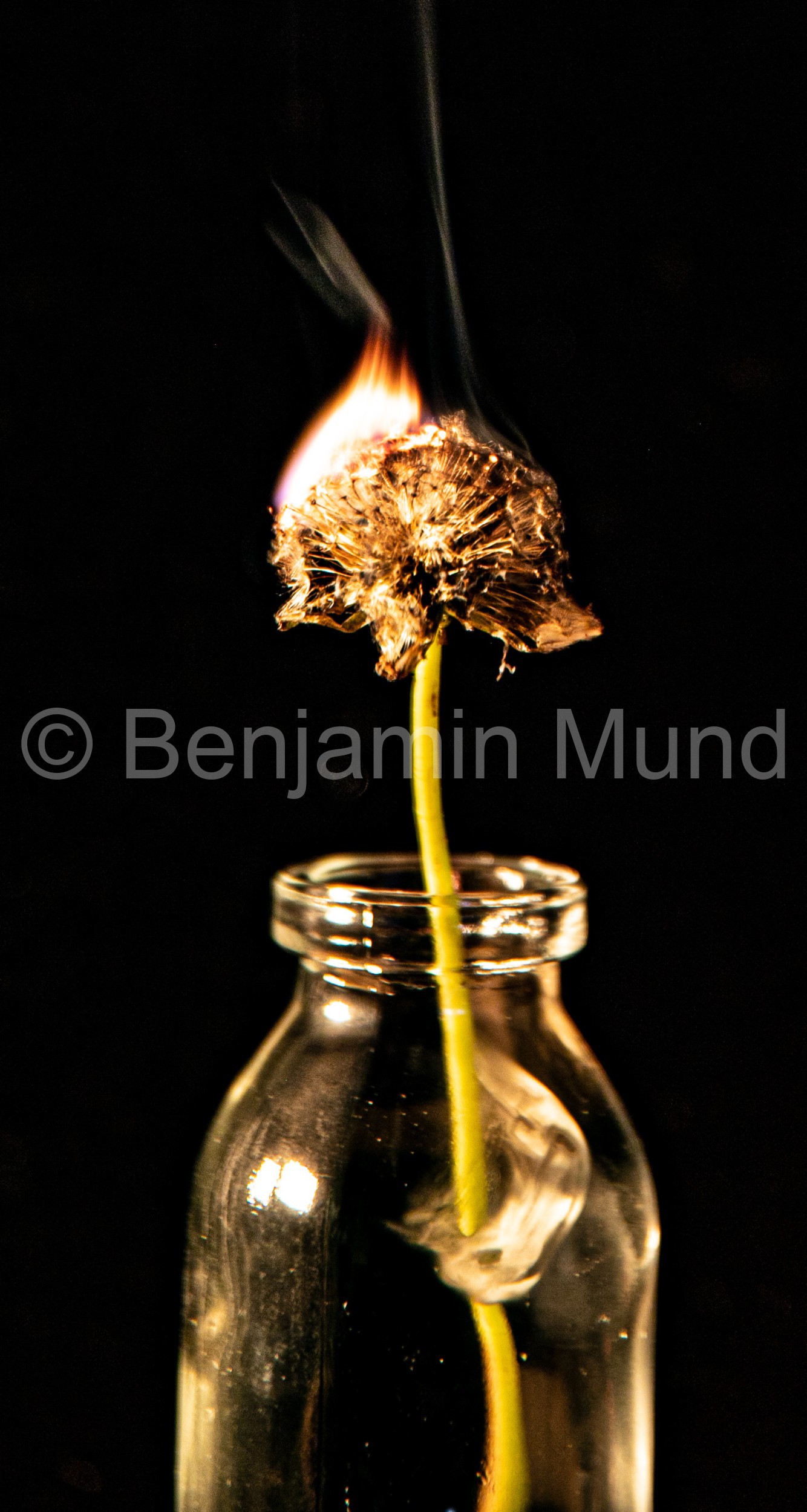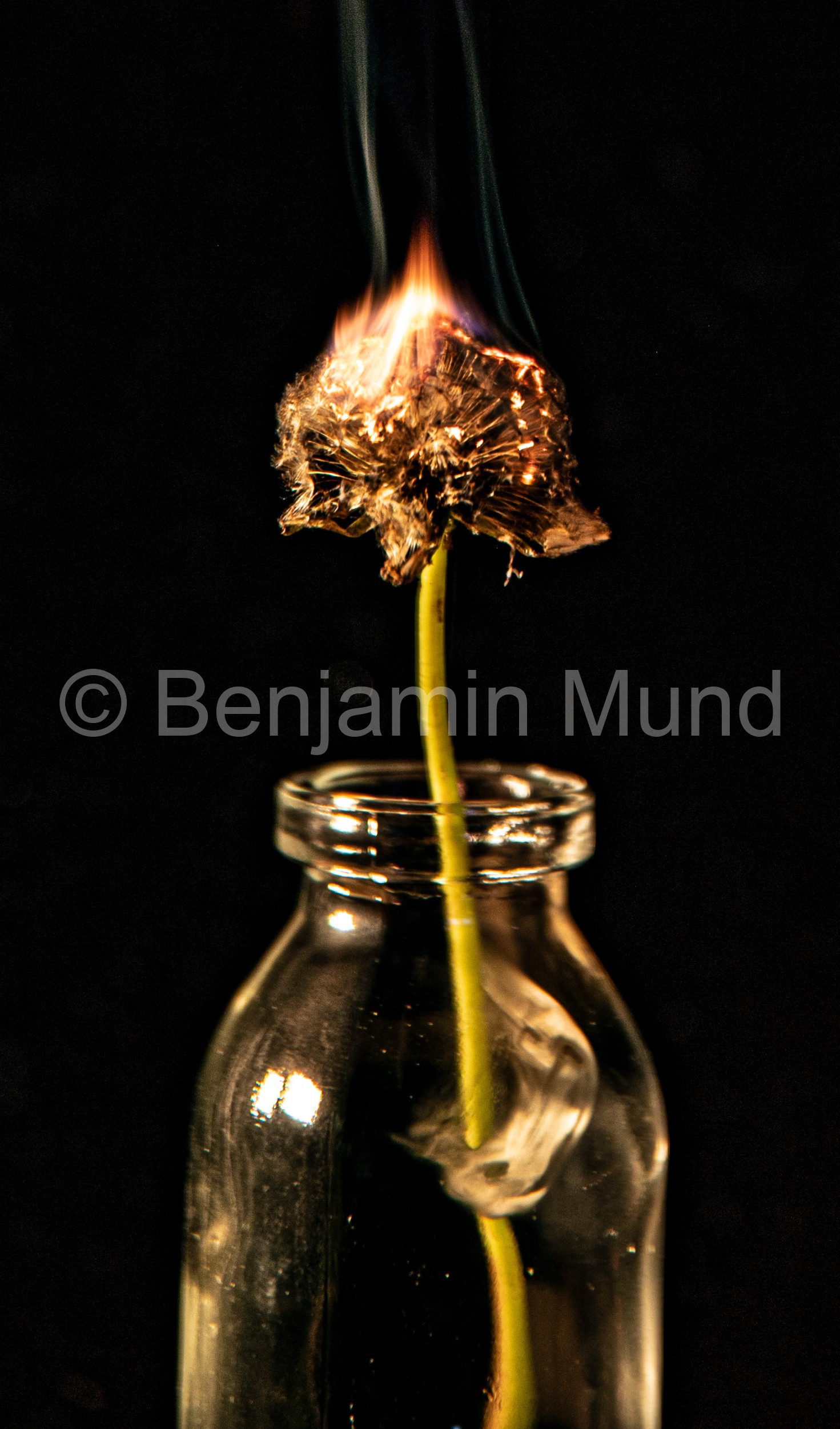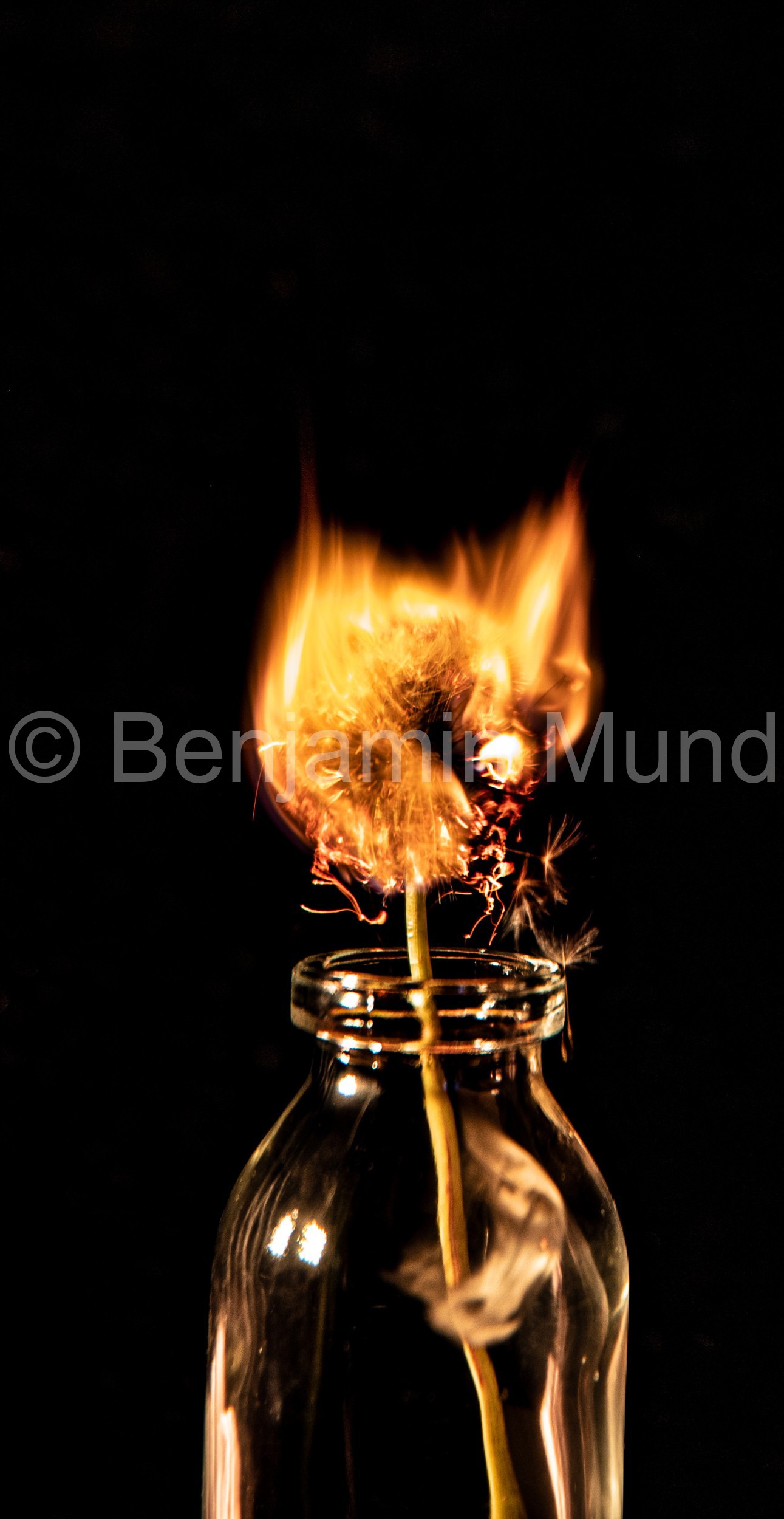 Ich hatte auf Youtube ein Video gefunden, in dem jemand eine Pusteblume verbrennt und dabei Fotos macht. Dies wollte ich auch einmal ausprobieren. Allerdings waren plötzlich alle Pusteblumen, die ich immer am Wegesrand gesehen hatte weg. Sie hatten wohl eine Vorahnung 😉